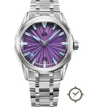 Eine Sport-Uhr mit einem 33.5mm Gehäuse im Vintage-Stil gefertigt aus Edelstahl mit einem Zifferblatt in lila und einer besonderen "engraved guilloché (radiating wave pattern)"-Oberfläche.
