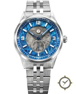 Eine Sport-Uhr mit einem markanten 42mm Auftritt am Handgelenk, gefertigt aus Edelstahl mit einem Zifferblatt in blau und einer besonderen "meteorite center with textured/brushed blue outer ring"-Oberfläche.
