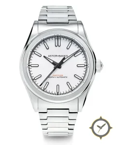 Eine Sport-Uhr mit einem 35.5mm Gehäuse im Vintage-Stil gefertigt aus Edelstahl mit einem Zifferblatt in weiß und einer besonderen "smooth lacquer"-Oberfläche.