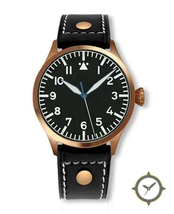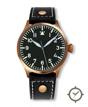 Eine Pilot-Uhr mit einem markanten 44mm Auftritt am Handgelenk, gefertigt aus Bronze mit einem Zifferblatt in schwarz und einer besonderen "matte"-Oberfläche.