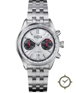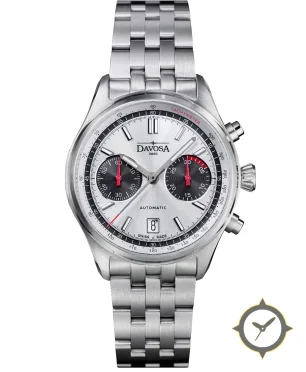 Eine Chronograph-Uhr mit einem markanten 45.5mm Auftritt am Handgelenk, gefertigt aus Edelstahl mit einem Zifferblatt in silber und einer besonderen "brushed sunburst"-Oberfläche.