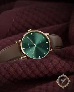 Eine Dress-Uhr mit einem 28.5mm Gehäuse im Vintage-Stil gefertigt aus Gold mit einem Zifferblatt in grün und einer besonderen "sunburst"-Oberfläche.