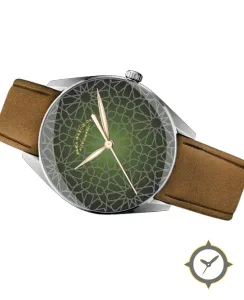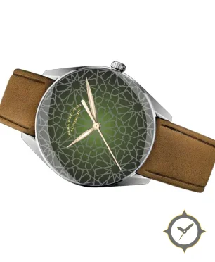 Eine Dress-Uhr mit einem 34mm Gehäuse im Vintage-Stil gefertigt aus Edelstahl mit einem Zifferblatt in grün und einer besonderen "gradient (fumé) with an applied/printed geometric star-lattice overlay"-Oberfläche.