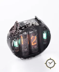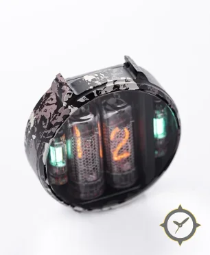 Eine Digital-Uhr mit einem markanten 65mm Auftritt am Handgelenk, gefertigt aus Beschichtung mit einem Zifferblatt in schwarz und einer besonderen "transparent showing nixie tubes"-Oberfläche.