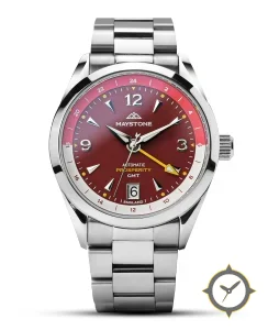Eine GMT-Uhr mit einem vielseitigen 40mm Gehäuse, das an fast jedes Handgelenk passt, gefertigt aus Edelstahl mit einem Zifferblatt in rot und einer besonderen "sunburst"-Oberfläche und einer echten GMT-Funktion, mit der du eine zweite Zeitzone verfolgen kannst.
