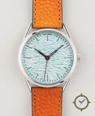 Eine Minimalistisch-Uhr mit einem vielseitigen 40.5mm Gehäuse, das an fast jedes Handgelenk passt, gefertigt aus Edelstahl mit einem Zifferblatt in türkis und einer besonderen "hammered / grained texture"-Oberfläche.
