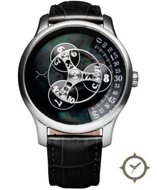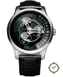 Eine Luxus-Uhr mit einem markanten 46.5mm Auftritt am Handgelenk, gefertigt aus Edelstahl mit einem Zifferblatt in schwarz und einer besonderen "iridescent mother-of-pearl finish"-Oberfläche.