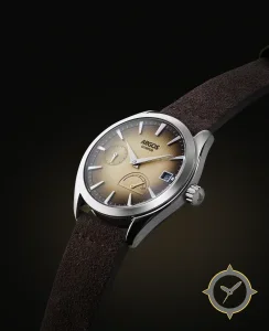Eine Dress-Uhr mit einem 31.5mm Gehäuse im Vintage-Stil gefertigt aus Edelstahl mit einem Zifferblatt in braun und einer besonderen "fumé gradient with light grained texture"-Oberfläche und einer praktischen Gangreserveanzeige.