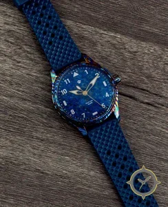 Eine Pilot-Uhr mit einem markanten 45.5mm Auftritt am Handgelenk, gefertigt aus Titan mit einem Zifferblatt in blau und einer besonderen "marbled/stone (lapis-like)"-Oberfläche.