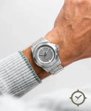 Eine Sport-Uhr mit einem 33.5mm Gehäuse im Vintage-Stil gefertigt aus Edelstahl mit einem Zifferblatt in grau und einer besonderen "brushed (vertical grain)"-Oberfläche.