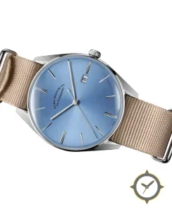 Eine Dress-Uhr mit einem vielseitigen 40.5mm Gehäuse, das an fast jedes Handgelenk passt, gefertigt aus Edelstahl mit einem Zifferblatt in blau und einer besonderen "sunburst"-Oberfläche.