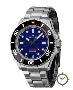 Eine Taucheruhr-Uhr mit einem 36.5mm Gehäuse im Vintage-Stil gefertigt aus Edelstahl mit einem Zifferblatt in blau und einer besonderen "stone (lapis-like textured)"-Oberfläche.