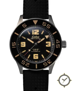 Eine Taucheruhr-Uhr mit einem markanten 42mm Auftritt am Handgelenk, gefertigt aus Edelstahl mit einem Zifferblatt in schwarz und einer besonderen "lacquer"-Oberfläche.