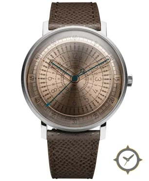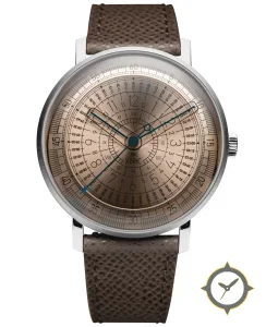 Eine Minimalistisch-Uhr mit einem vielseitigen 39mm Gehäuse, das an fast jedes Handgelenk passt, gefertigt aus Edelstahl mit einem Zifferblatt in braun und einer besonderen "sunburst (brushed)"-Oberfläche.
