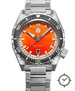 Eine Taucheruhr-Uhr mit einem markanten 49.5mm Auftritt am Handgelenk, gefertigt aus Edelstahl mit einem Zifferblatt in orange und einer besonderen "wavy sunburst"-Oberfläche.