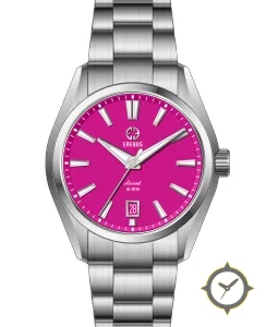 Eine Sport-Uhr mit einem vielseitigen 38.5mm Gehäuse, das an fast jedes Handgelenk passt, gefertigt aus Edelstahl mit einem Zifferblatt in lila und einer besonderen "smooth lacquer"-Oberfläche.