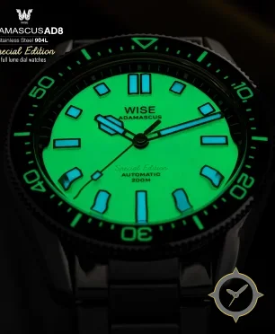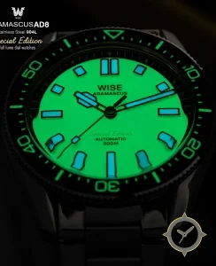Eine Taucheruhr-Uhr mit einem 33.5mm Gehäuse im Vintage-Stil gefertigt aus Edelstahl mit einem Zifferblatt in grün und einer besonderen "full-lume"-Oberfläche.
