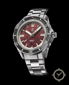 Eine Taucheruhr-Uhr mit einem 34mm Gehäuse im Vintage-Stil gefertigt aus Edelstahl mit einem Zifferblatt in rot und einer besonderen "meteorite-style textured finish (cross-hatched)"-Oberfläche.