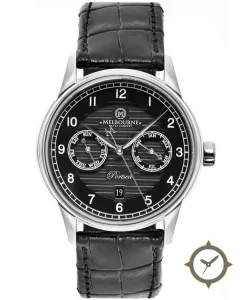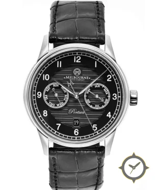Eine Dress-Uhr mit einem vielseitigen 40.5mm Gehäuse, das an fast jedes Handgelenk passt, gefertigt aus Edelstahl mit einem Zifferblatt in schwarz und einer besonderen "horizontal striped guilloché / ridged texture"-Oberfläche.