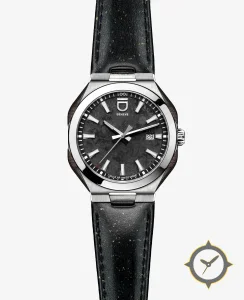 Eine Sport-Uhr mit einem vielseitigen 39.5mm Gehäuse, das an fast jedes Handgelenk passt, gefertigt aus Edelstahl mit einem Zifferblatt in grau und einer besonderen "meteorite / marbled texture"-Oberfläche.