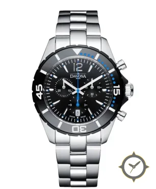 Eine Taucheruhr-Uhr mit einem markanten 49mm Auftritt am Handgelenk, gefertigt aus Edelstahl mit einem Zifferblatt in schwarz und einer besonderen "glossy"-Oberfläche.