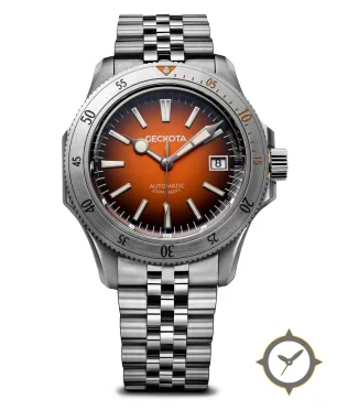 Eine Taucheruhr-Uhr mit einem 35.5mm Gehäuse im Vintage-Stil gefertigt aus Edelstahl mit einem Zifferblatt in orange und einer besonderen "sunburst"-Oberfläche.