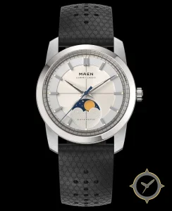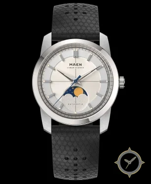 Eine Dress-Uhr mit einem 36mm Gehäuse im Vintage-Stil gefertigt aus Edelstahl mit einem Zifferblatt in silber und einer besonderen "sunburst center with textured outer ring and guilloche-style moon aperture"-Oberfläche und einer wunderschönen Mondphasenanzeige.