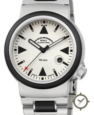 Eine Taucheruhr-Uhr mit einem markanten 45mm Auftritt am Handgelenk, gefertigt aus Edelstahl mit einem Zifferblatt in weiß und einer besonderen "matte"-Oberfläche.
