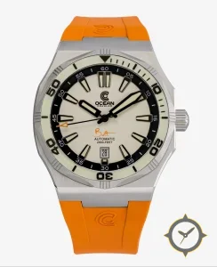 Eine Taucheruhr-Uhr mit einem markanten 48.5mm Auftritt am Handgelenk, gefertigt aus Edelstahl mit einem auffälligen weiß Zifferblatt.