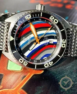 Eine Taucheruhr-Uhr mit einem markanten 50mm Auftritt am Handgelenk, gefertigt aus Edelstahl mit einem Zifferblatt in schwarz und einer besonderen "painted multicolor wave stripes"-Oberfläche.