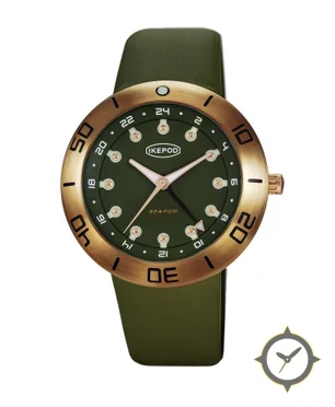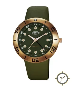 Eine GMT-Uhr mit einem markanten 51.5mm Auftritt am Handgelenk, gefertigt aus Bronze mit einem Zifferblatt in grün und einer besonderen "matte"-Oberfläche und einer echten GMT-Funktion, mit der du eine zweite Zeitzone verfolgen kannst.