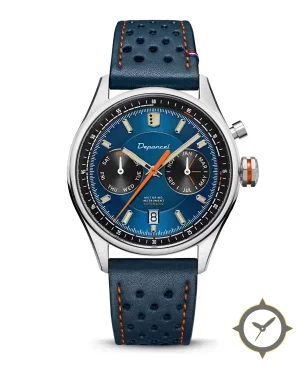 Eine Racing-Uhr mit einem markanten 45.5mm Auftritt am Handgelenk, gefertigt aus Edelstahl mit einem Zifferblatt in blau und einer besonderen "sunburst"-Oberfläche.
