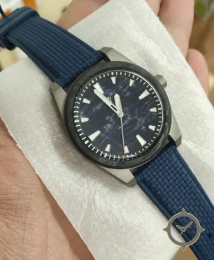 Eine Sport-Uhr mit einem markanten 46.5mm Auftritt am Handgelenk, gefertigt aus Titan mit einem Zifferblatt in blau und einer besonderen "marble-like/stone texture"-Oberfläche.