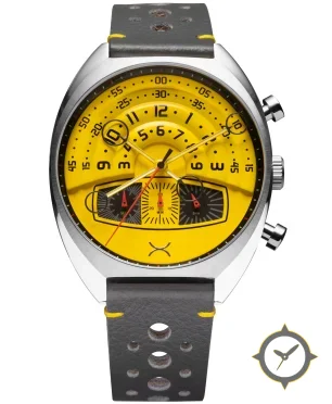 Eine Racing-Uhr mit einem markanten 49.5mm Auftritt am Handgelenk, gefertigt aus Edelstahl mit einem Zifferblatt in gelb und einer besonderen "lacquer"-Oberfläche.