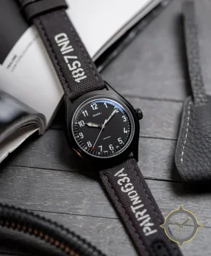 Eine Field-Uhr mit einem markanten 44.5mm Auftritt am Handgelenk, gefertigt aus Edelstahl mit einem Zifferblatt in schwarz und einer besonderen "matte"-Oberfläche.