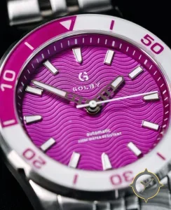 Eine Taucheruhr-Uhr mit einem 37.5mm Gehäuse im Vintage-Stil gefertigt aus Edelstahl mit einem Zifferblatt in lila und einer besonderen "wavy guilloché (wave texture)"-Oberfläche.