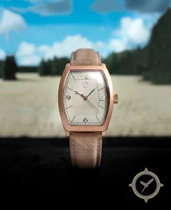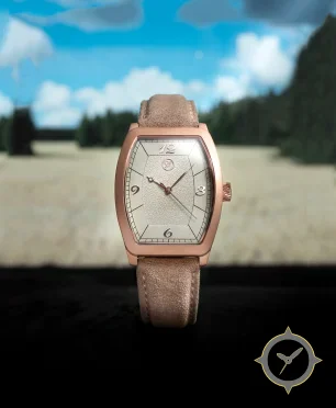 Eine Dress-Uhr mit einem 29.5mm Gehäuse im Vintage-Stil gefertigt aus Gold mit einem Zifferblatt in weiß und einer besonderen "grained/sandblasted finish"-Oberfläche.