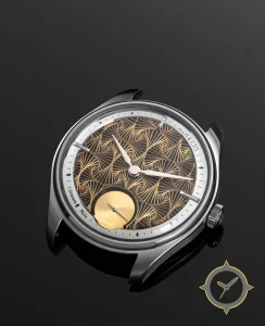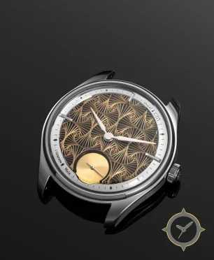 Eine Dress-Uhr mit einem 37.5mm Gehäuse im Vintage-Stil gefertigt aus Edelstahl mit einem Zifferblatt in gold und einer besonderen "engraved/filigree openworked texture"-Oberfläche.