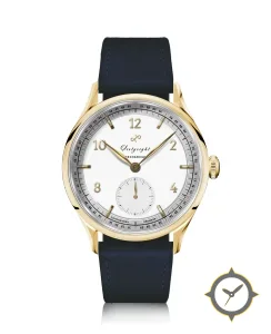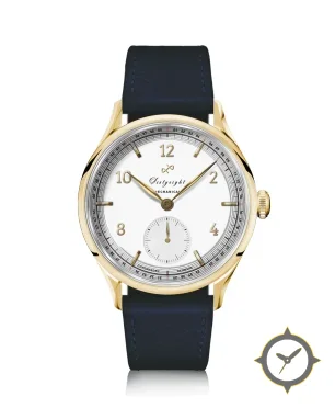 Eine Dress-Uhr mit einem 37mm Gehäuse im Vintage-Stil gefertigt aus Gold mit einem Zifferblatt in weiß und einer besonderen "smooth-matte"-Oberfläche.