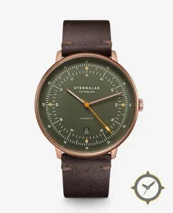 Eine Minimalistisch-Uhr mit einem 36.5mm Gehäuse im Vintage-Stil gefertigt aus Beschichtung mit einem Zifferblatt in grün und einer besonderen "matte"-Oberfläche.