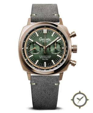 Eine Chronograph-Uhr mit einem markanten 49.5mm Auftritt am Handgelenk, gefertigt aus Bronze mit einem Zifferblatt in grün und einer besonderen "sunburst metallic"-Oberfläche.