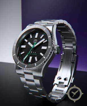 Eine Taucheruhr-Uhr mit einem 32mm Gehäuse im Vintage-Stil gefertigt aus Edelstahl mit einem Zifferblatt in schwarz und einer besonderen "wave"-Oberfläche.