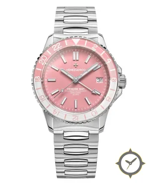 Eine GMT-Uhr mit einem 35mm Gehäuse im Vintage-Stil gefertigt aus Edelstahl mit einem Zifferblatt in karmesinrot und einer besonderen "sunburst"-Oberfläche und einer echten GMT-Funktion, mit der du eine zweite Zeitzone verfolgen kannst.