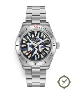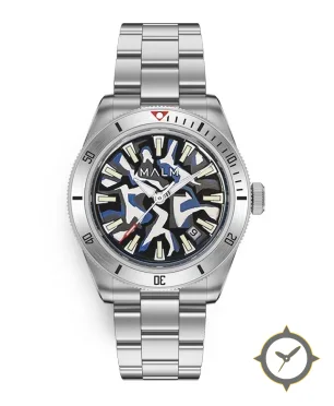 Eine Taucheruhr-Uhr mit einem vielseitigen 39mm Gehäuse, das an fast jedes Handgelenk passt, gefertigt aus Edelstahl mit einem Zifferblatt in blau und einer besonderen "glossy with multi-color camouflage motif"-Oberfläche.