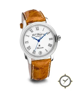 Eine Dress-Uhr mit einem 36mm Gehäuse im Vintage-Stil gefertigt aus Edelstahl mit einem Zifferblatt in weiß und einer besonderen "enamel"-Oberfläche.