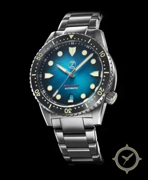 Eine Taucheruhr-Uhr mit einem markanten 47.5mm Auftritt am Handgelenk, gefertigt aus Edelstahl mit einem Zifferblatt in blau und einer besonderen "sunburst"-Oberfläche.
