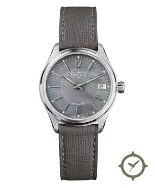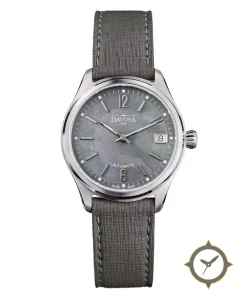 Eine Dress-Uhr mit einem vielseitigen 39.5mm Gehäuse, das an fast jedes Handgelenk passt, gefertigt aus Edelstahl mit einem Zifferblatt in grau und einer besonderen "mother-of-pearl"-Oberfläche.