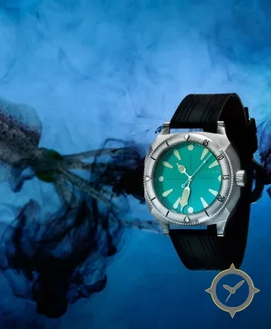 Eine Taucheruhr-Uhr mit einem markanten 44mm Auftritt am Handgelenk, gefertigt aus Edelstahl mit einem Zifferblatt in türkis und einer besonderen "matte"-Oberfläche.