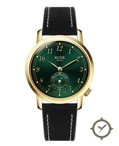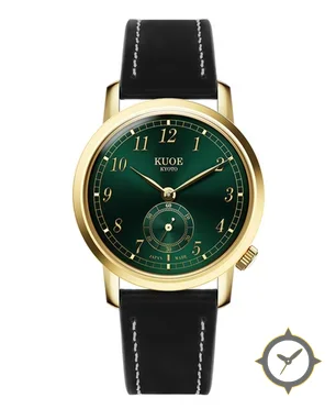 Eine Dress-Uhr mit einem 35.5mm Gehäuse im Vintage-Stil gefertigt aus Gold mit einem Zifferblatt in grün und einer besonderen "sunburst/gradient"-Oberfläche.
