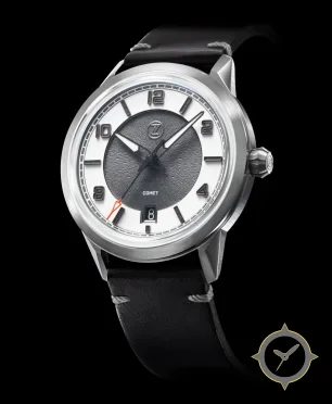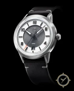 Eine Field-Uhr mit einem markanten 41.5mm Auftritt am Handgelenk, gefertigt aus Edelstahl mit einem Zifferblatt in grau und einer besonderen "textured/grained central area with smooth outer chapter ring"-Oberfläche.